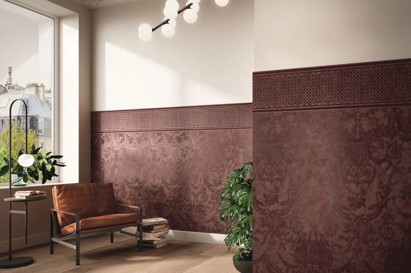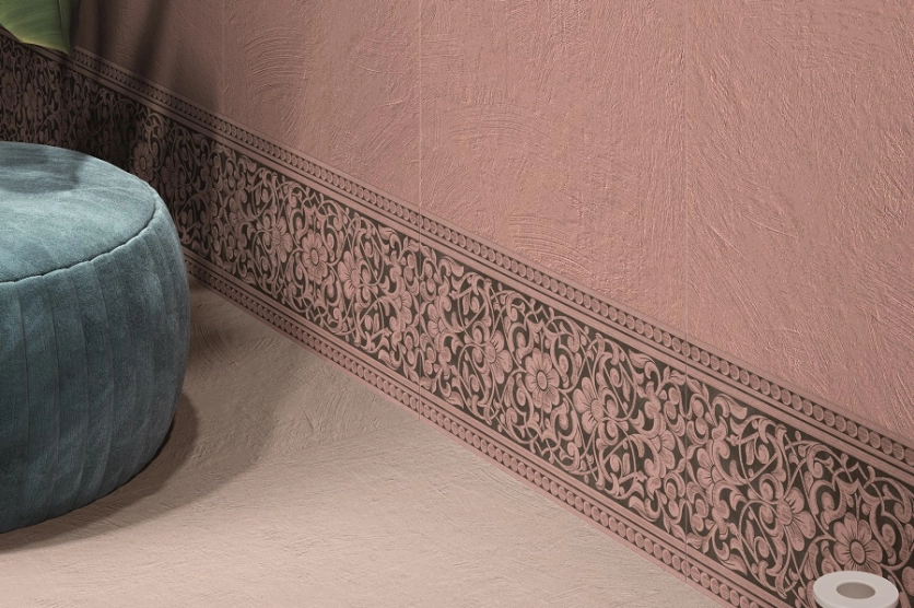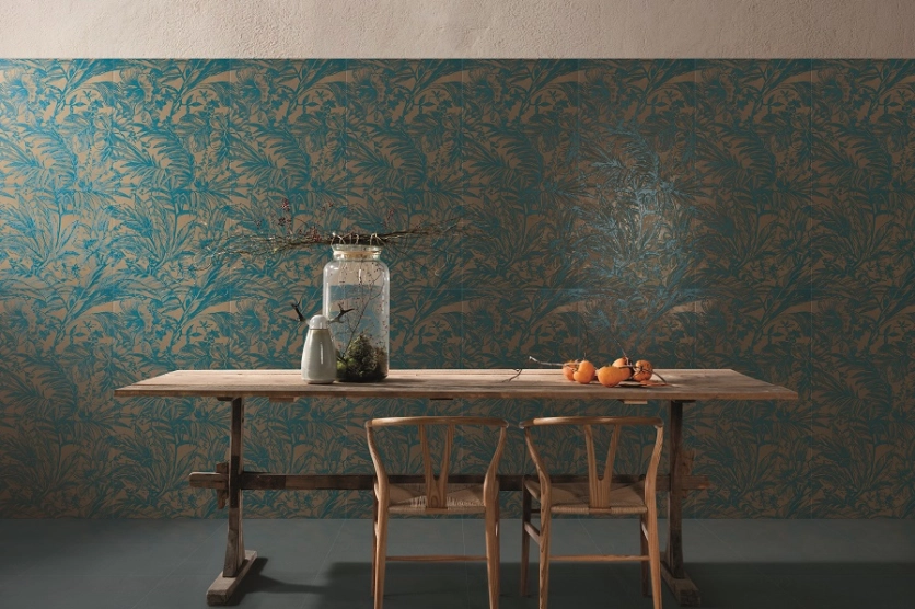 Avec ses décors effet papier peint, cette nouvelle gamme de carrelage pour les murs et le sol nous transporte immédiatement dans un univers magique, où fleurs, branches d’herbe, toile de Jouy, damassé, ton sur ton se coordonnent avec une palette d’unis intenses prenant l’aspect d’un ciment taloché à la main. Les frises et autres panneaux décoratifs viennent parfaire une impression de majesté.