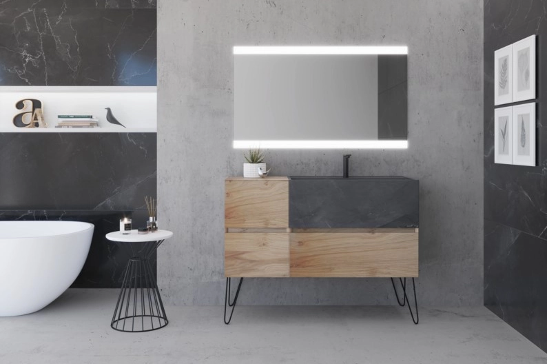 Meuble de salle de bain Hampton : élégance et authenticité, bois et marbre de qualité. Pieds métal noir pour un design industriel.