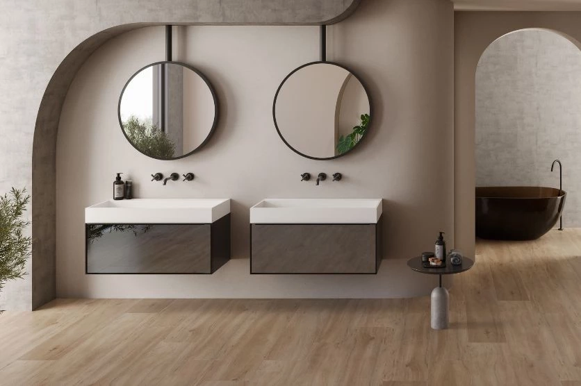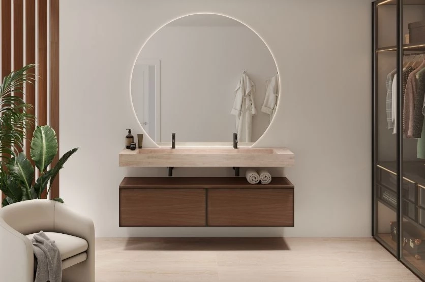 Meuble de salle de bain Tokyo suspendu, simple ou double vasque, façade en verre miroir, verre fumé ou bois. Plan vasque en marbre ou compact.